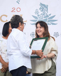 En este marco, la mandataria realizó la entrega de las dos primeras certificaciones de uso de Denominación de Origen Mezcal de Morelos, otorgadas por el Instituto Mexicano de la Propiedad Industrial (IMPI), a las y los productores Emma Cazales Quintero y Alfredo Vargas Sánchez, de las empresas “Cazales”, de Tlaquiltenango, y “Xonesco”, de Palpan, municipio de Miacatlán, respectivamente, quienes ya podrán comercializar su producto a nivel nacional e internacional.